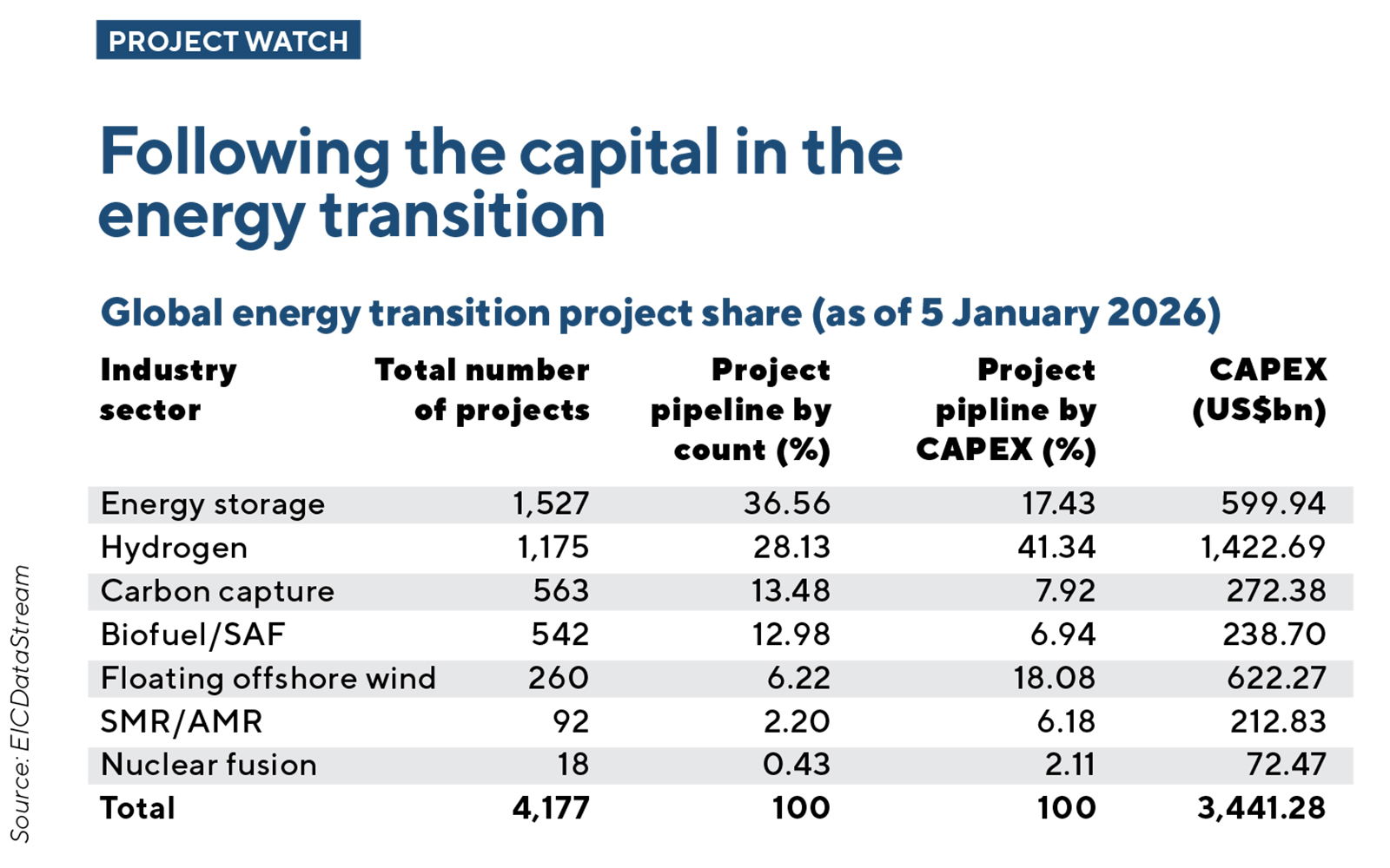 EICDataStream is currently tracking 4,177 energy transition projects around the world, with total estimated CAPEX of US$3.44tn. Energy storage dominates the pipeline at 37%, followed by hydrogen at 28%, carbon capture at 14% and biofuels and sustainable aviation fuel (SAF) at 13%. Floating offshore wind and small or advanced modular nuclear reactors (SMRs and AMRs) also represent growing opportunities.